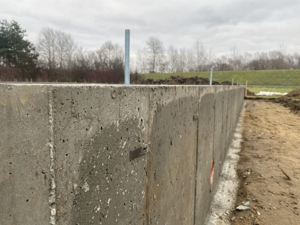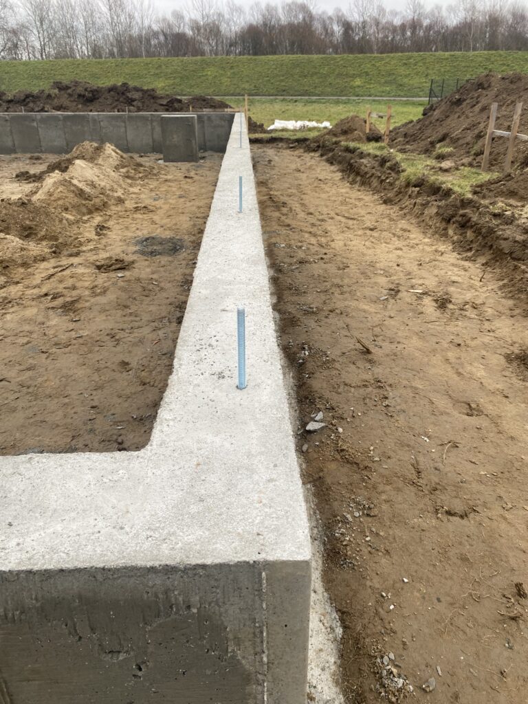 - Bezpośrednio po wylaniu ścian fundamentowych kotwimy pręty gwintowane (lub kotwy chemiczne), które posłużą do trwałego przytwierdzenia dolnej belki podwalinowej szkieletu.